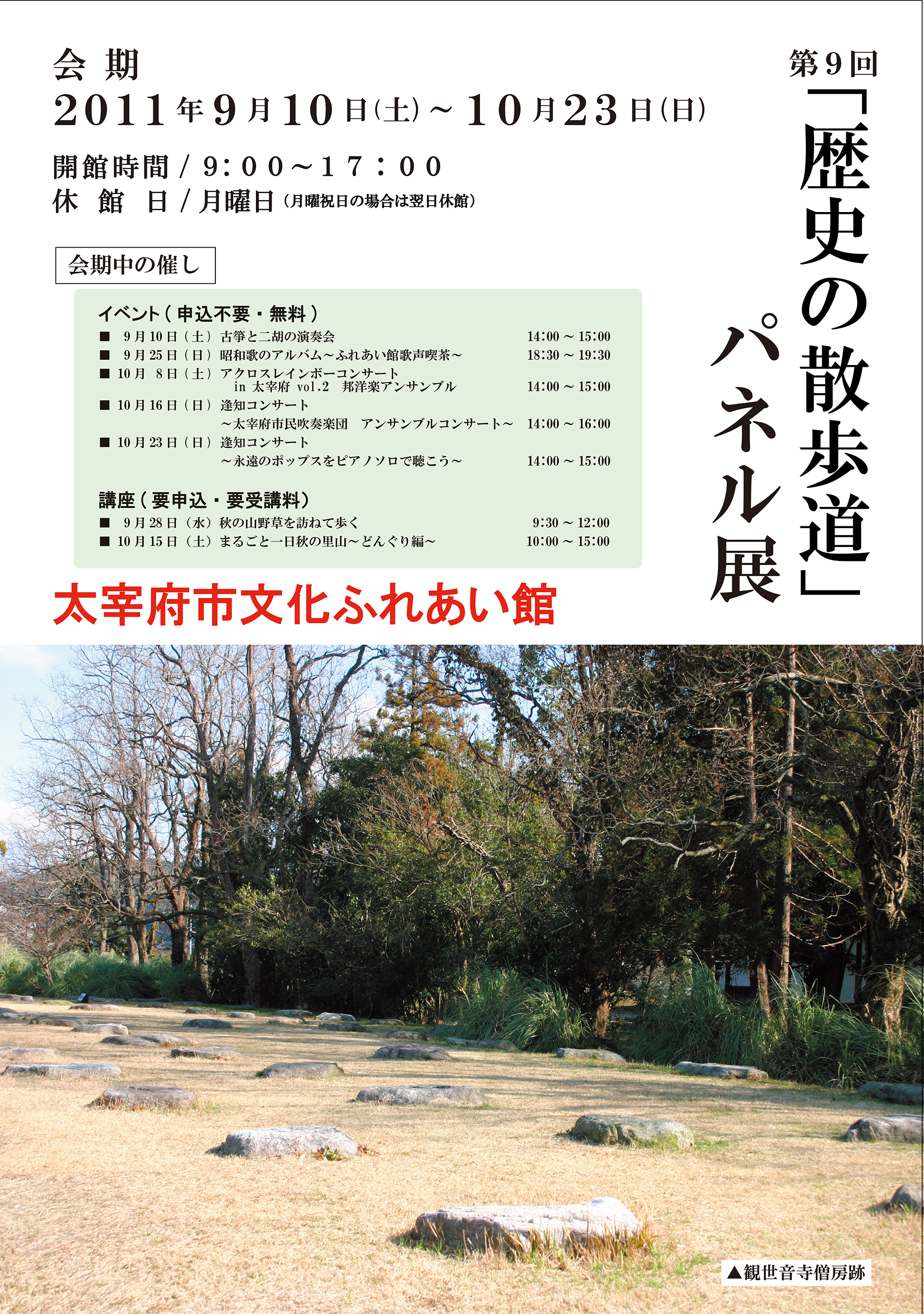 今回の展覧会では、水城跡から太宰府天満宮までの途中に点在する史跡を、写真や解説パネルで紹介します。近年の行事調査で撮影した写真なども展示し、史跡周辺の「今の姿」を伝えるとともに、散策途中にみなさんが疑問に感じたことを解決する一助となるような展示を行っています。