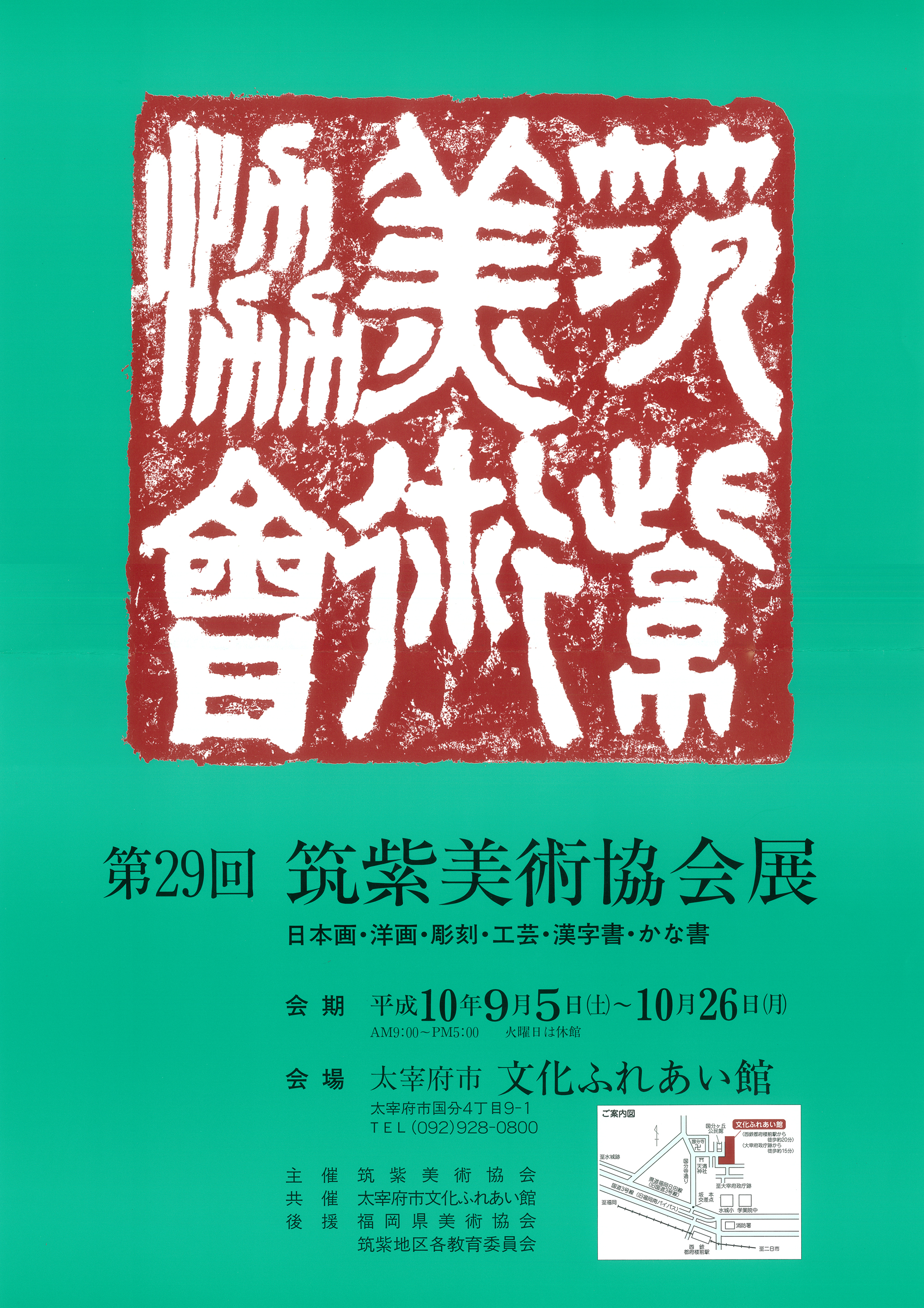 昭和45年発足以来、筑紫地区在住の作家が集まり、地域文化の向上につとめてきた筑紫美術協会の会員による作品展。日本画・洋画・彫刻・工芸・書の地元作家の作品を一堂に展示。 展覧会 会期 1998年9月05日(土) ~ 1998年10月26日(月) 主催 筑紫美術協会 共催 太宰府市文化ふれあい館 後援 福岡県美術協会、筑紫地区各教育委員会