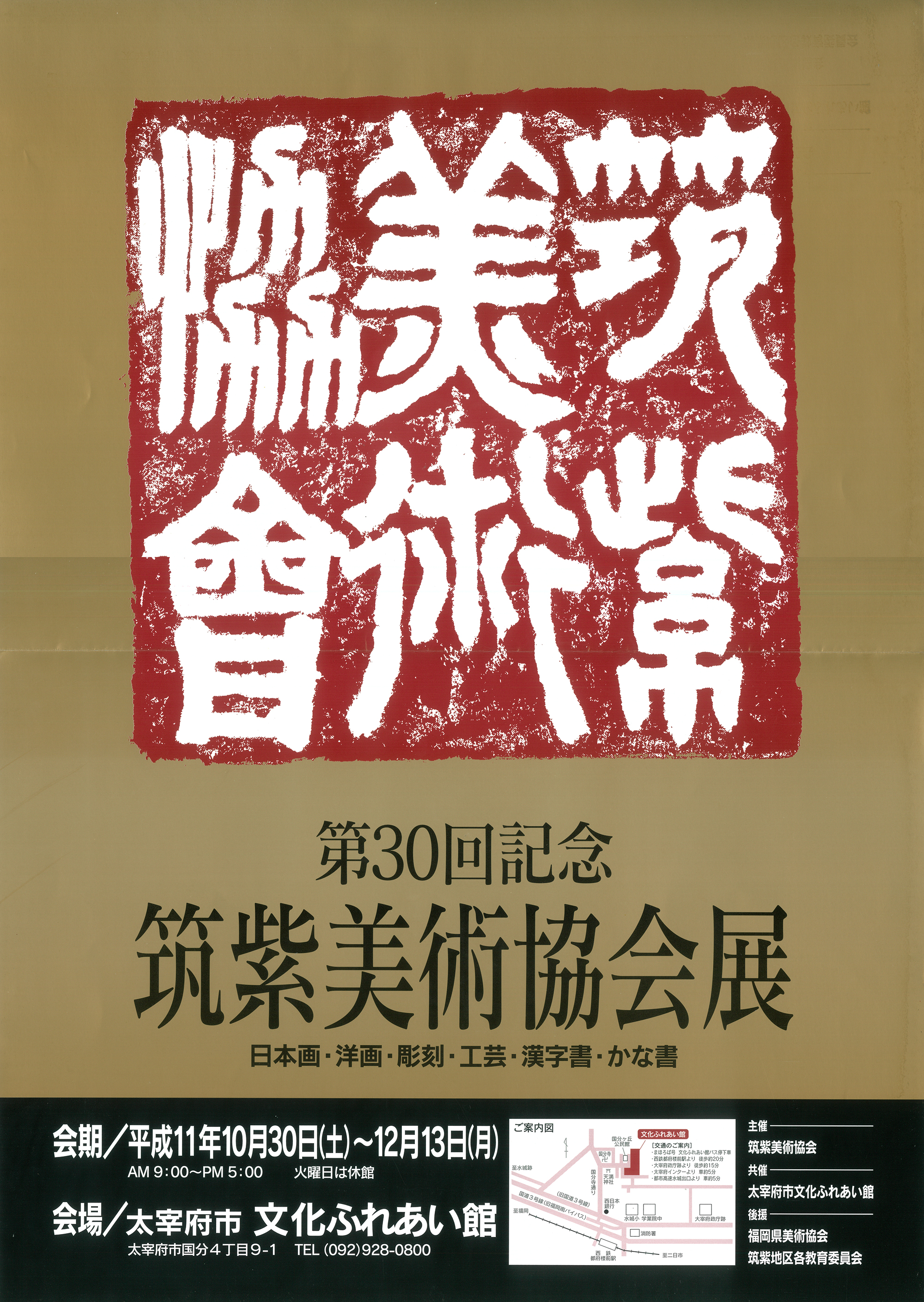 昭和45年の発足以来、地域文化向上につとめてきた筑紫美術協会の会員による作品展。日本画・洋画・彫刻・工芸・書など地元作家の作品を一堂に展示。 展覧会 会期 1999年10月30日(土) ~ 1999年12月13日(月) 主催 筑紫美術協会 共催 太宰府市文化ふれあい館 後援 福岡県美術協会、筑紫地区各教育委員会