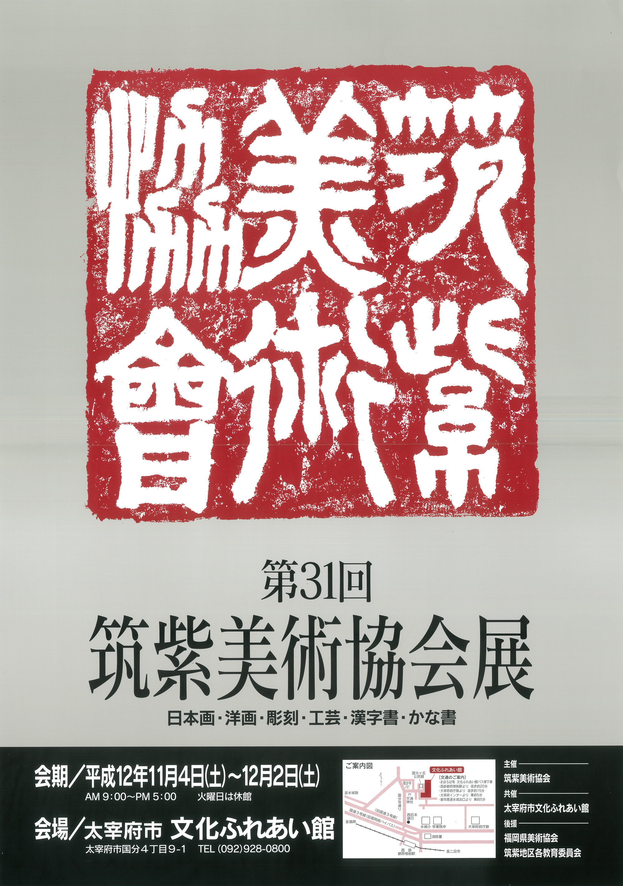 昭和45年に発足した筑紫美術協会は、冨永朝堂・二科十朗・島一行ら名だたる作家を多数輩出し、地域の美術を愛好する人々に永きにわたって親しまれてきました。筑紫地区在住・在勤の会員による日本画・洋画・彫刻・工芸・書の作品を一堂に展示します。 展覧会 会期 2000年11月04日(土) ~ 2000年12月02日(土) 主催 筑紫美術協会 共催 太宰府市文化ふれあい館
