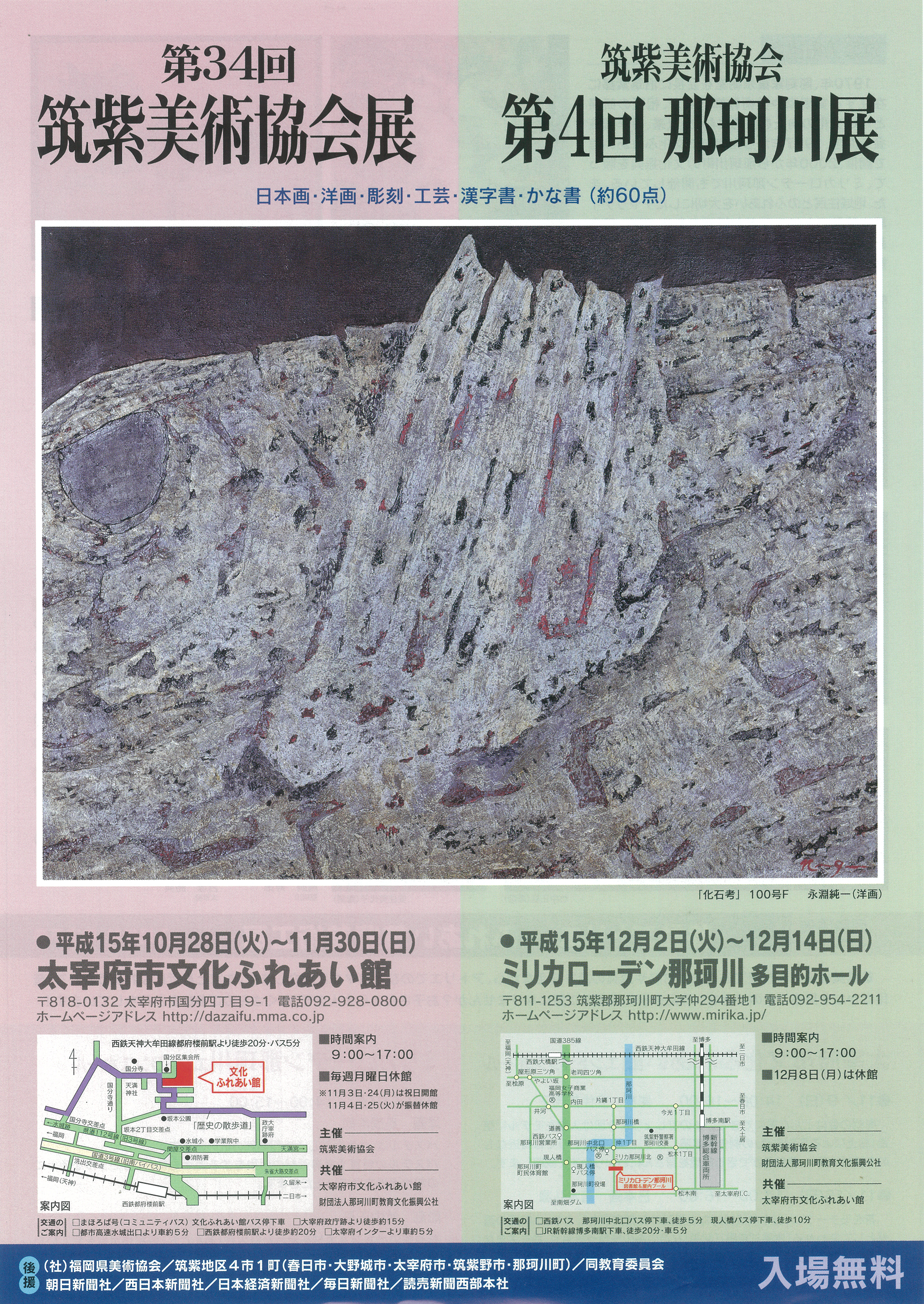 昭和45年、太宰府のアトリエで創作していた彫刻家冨永朝堂のもとに筑紫地区の美術家が集まり、相互研さんと地域文化向上を目指して筑紫美術協会が結成されました。現在の会員による、日本画・洋画・彫刻・工芸・漢書・かな書の約60点の作品を展示します。