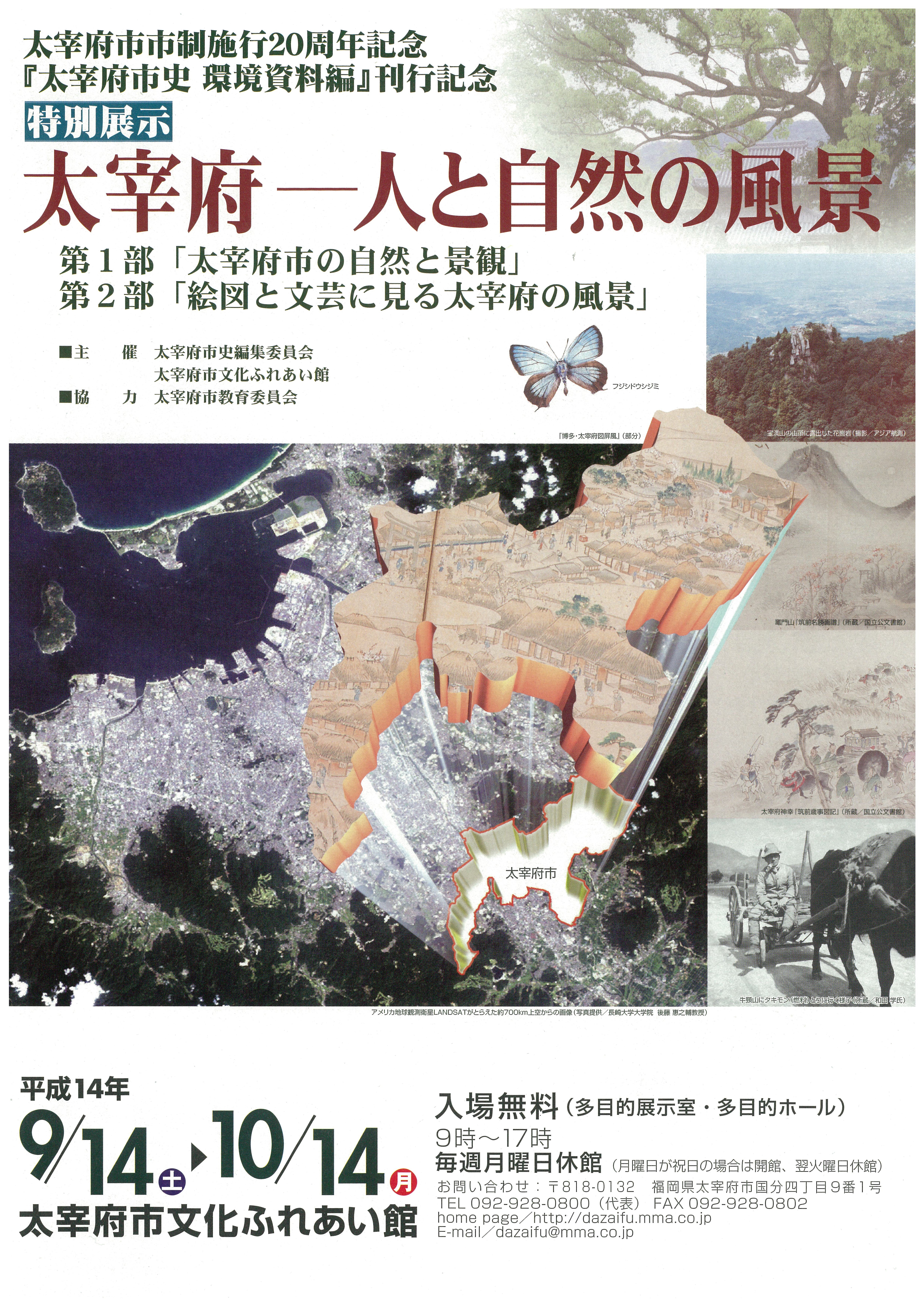 市制施行から20年を迎えたことを機会に、本展では太宰府市の「歴史とみどり」を構成するさまざまな要素を二部立てで概観しながら、九州国立博物館の開館に向けて今後街が大きく変容していくことが予想される中で、未来に遺したい太宰府の風景について考えます。