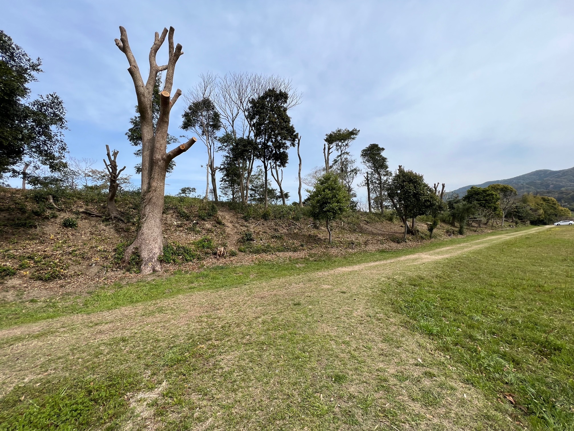 市内で実施している近年の史跡整備事業や計画の策定などについて紹介します。画像は「水城跡の樹木剪定・伐採」です。